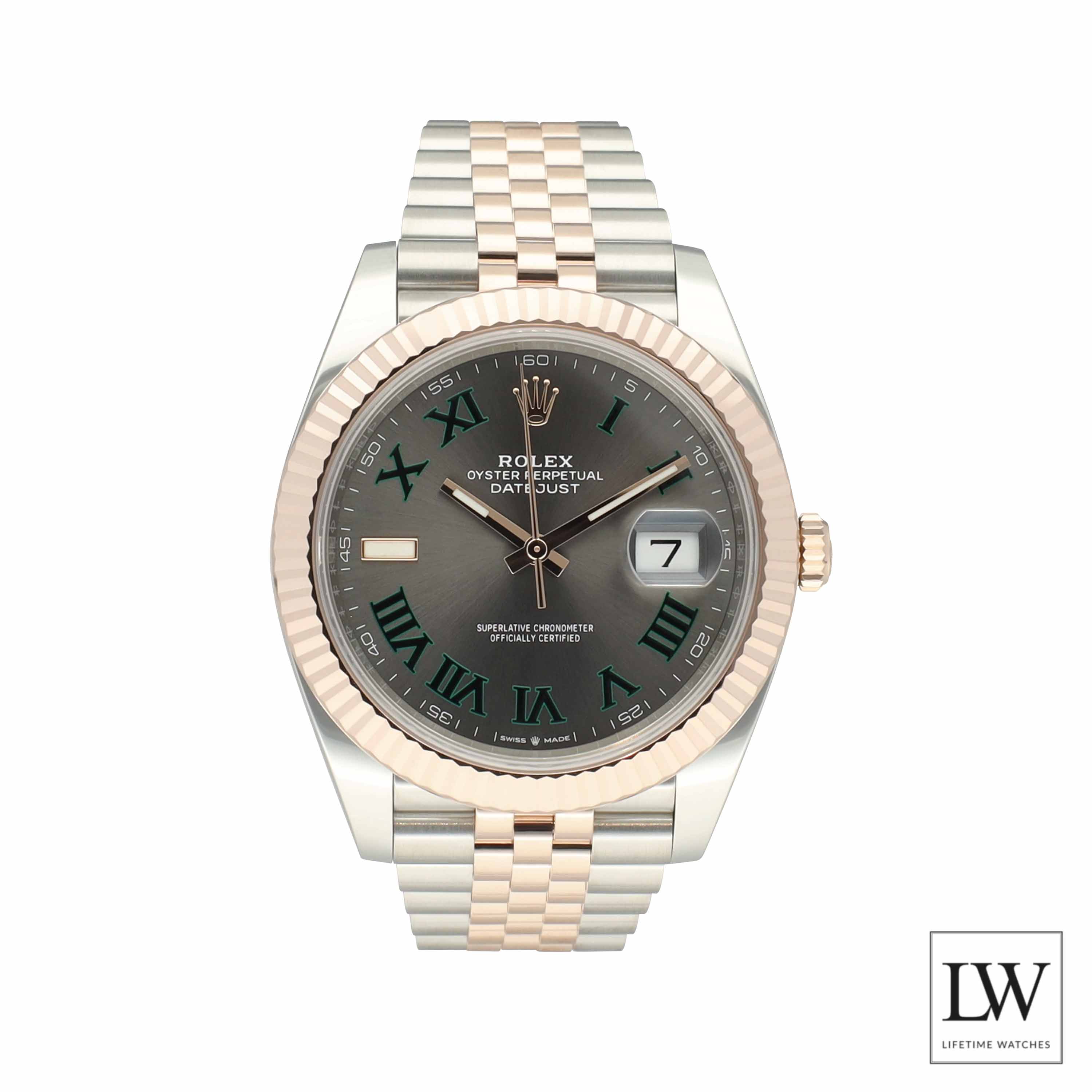 De Datejust 126331 uit 2025 combineert Oystersteel met 18 karaat Everose-goud, een materiaalkeuze die bekendstaat als de eigen roségoudlegering van Rolex. De 41 mm kast en de fluted bezel in Everose-goud geven dit horloge een luxe en onderscheidende uitstraling. De rhodiumkleurige ‘Wimbledon’ wijzerplaat met groene Romeinse cijfers maakt dit exemplaar extra bijzonder.