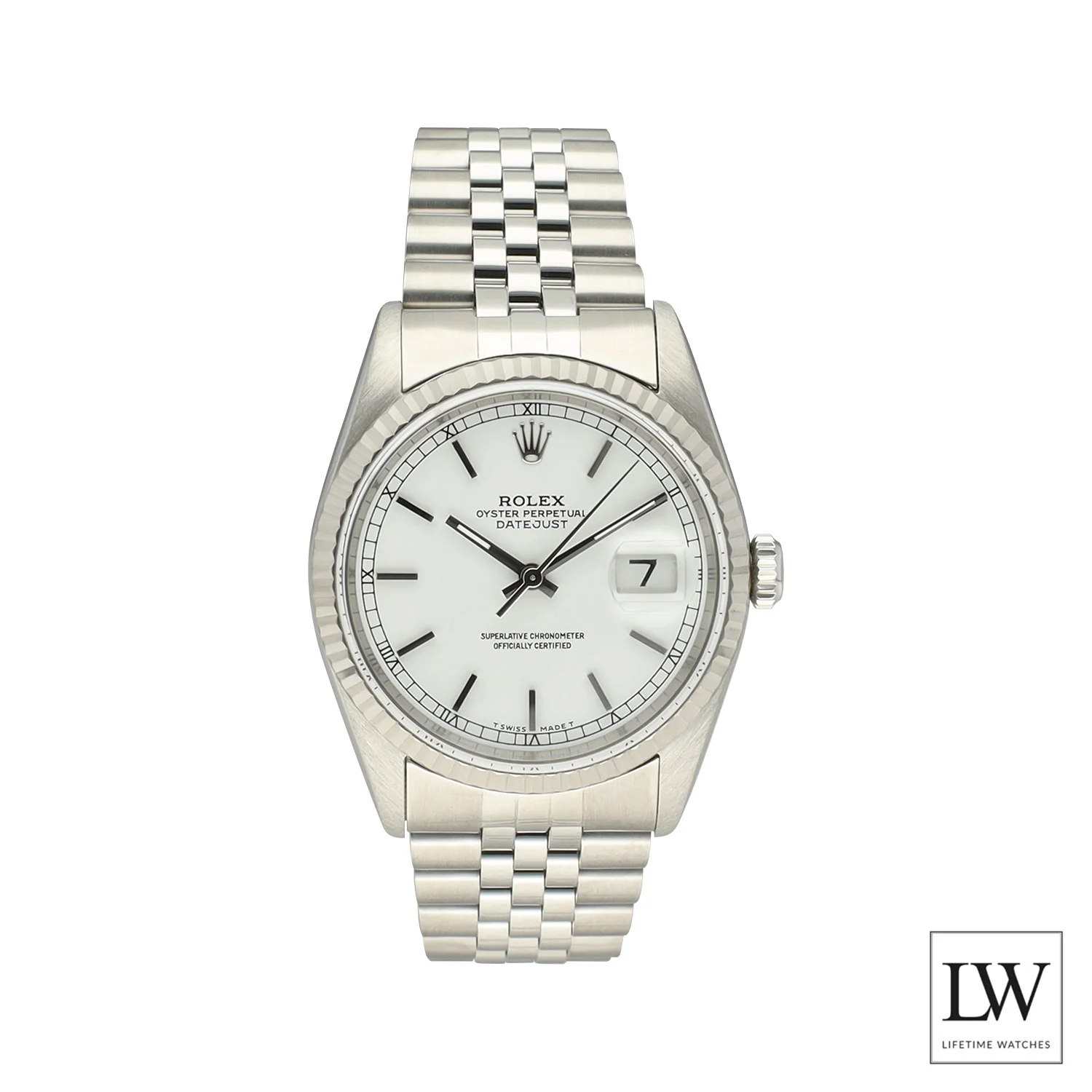De 36mm Oyster kast in edelstaal wordt gecombineerd met een 18k witgouden fluted bezel, een kenmerkend detail dat direct herkend wordt binnen de Datejust-lijn. De datum wordt weergegeven onder het iconische Cyclops-glas op 3 uur, een signature feature waar Rolex sinds 1945 om bekendstaat.