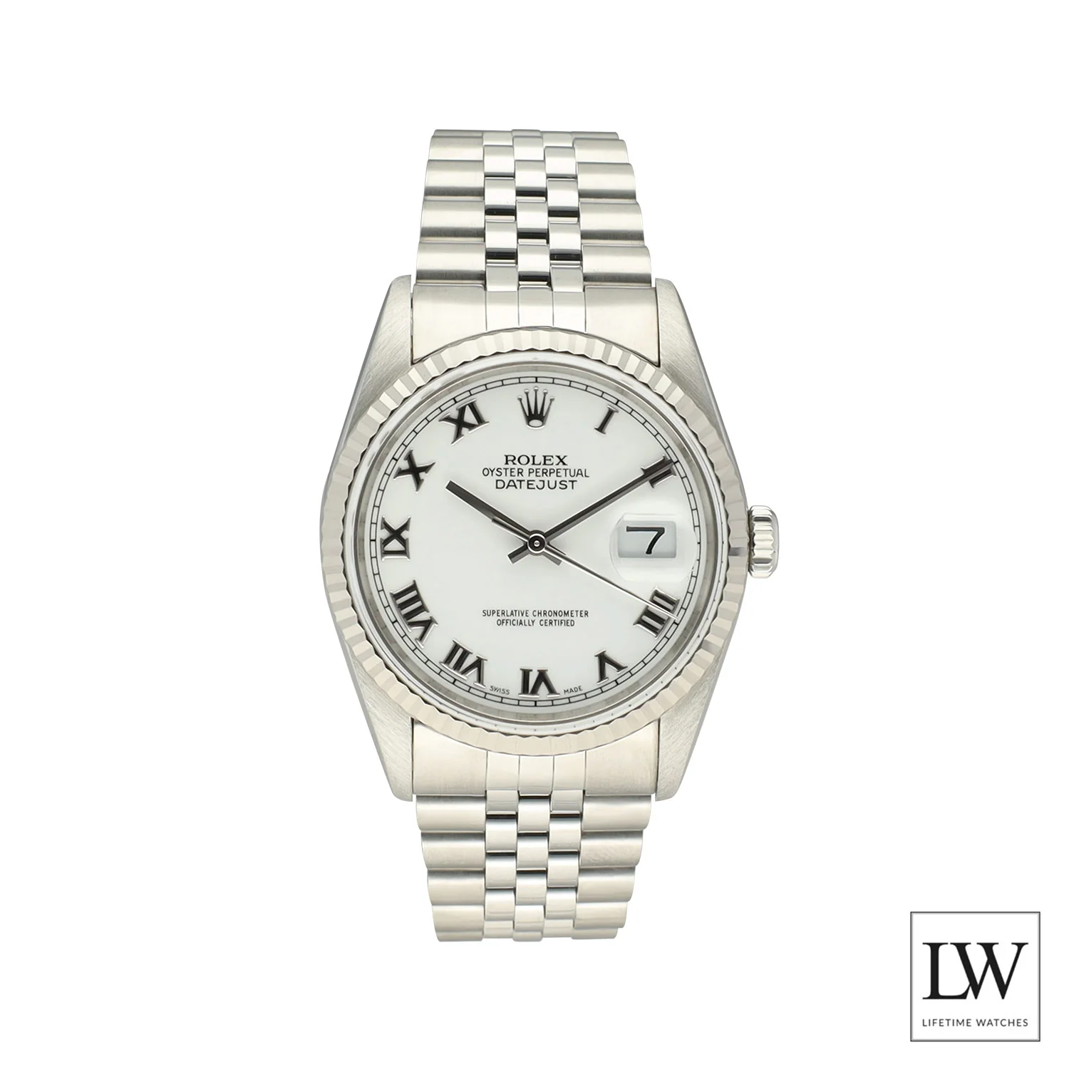 Deze Rolex Datejust 16234 uit 1998 is een tijdloze klassieker met een White Roman wijzerplaat, een stijl die bekendstaat om zijn elegante en rijke uitstraling. Uitgerust met een Jubilee armband en de iconische fluted witgouden bezel, straalt dit horloge pure klasse uit — geschikt voor zowel dagelijks gebruik als formele gelegenheden.